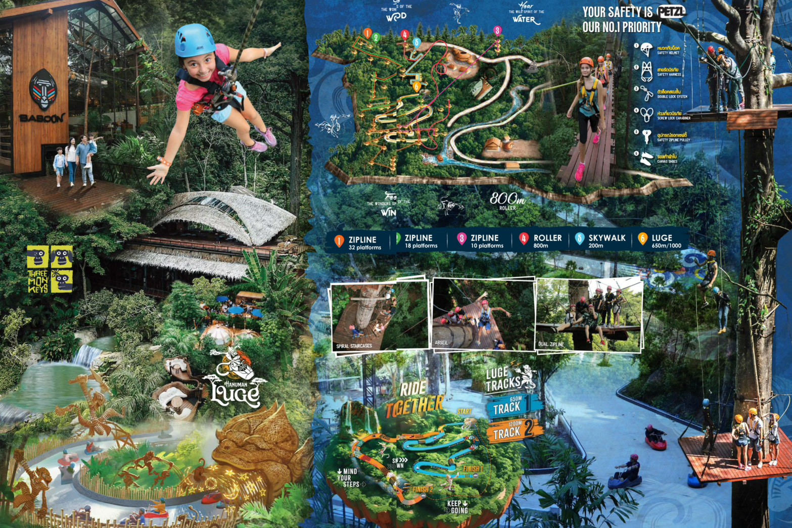 從入門到高階共 32 個平台,可依喜好選擇不同挑戰難度;結合滑輪與天空步道,俯瞰綠意叢林全景。